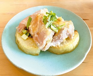 3 | 天板に大根を並べ、「2」を平らにしてのせる。オーブン200℃で25分ほど焼き、盛りつける。あれば、大根葉を刻んで散らす。 |